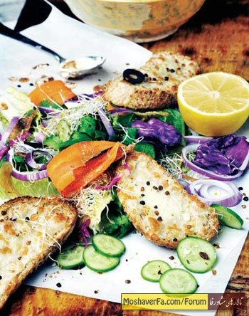 مواد لازم نان ماست و خردل: نان حجمی یک عدد پنیر چدار یا گودا 100 گرم ماست ساده 4 قاشق غذاخوری تخم خردل 2 قاشق غذاخوری سس ورچستر شایر (سس سنتی انگلیسی) یک قاشق غذاخوری سس فلفل تند به میزان لازم سالاد پیاز قرمز کوچک یک عدد خیار متوسط یک عدد هویج یک عدد لیموترش یک عدد روغن زیتون بکر 2 قاشق غذاخوری جعفری یک دسته کوچک کاهو 200 گرم جوانه 50 گرم سرکه بالزامیک به میزان لازم پنیر فتا 10 گرم مواد لازم سس جگر: ژامبون 2 ورقه روغن زیتون به میزان لازم جگر مرغ 400 گرم سرکه قرمز 100 میلی لیتر ماست 2 قاشق غذاخوری روش تهیه: 1 - نان را ورقه کنید. دو طرف آن را کمی گریل کنید. پنیر چدار را در یک کاسه رنده کرده و با ماست، خردل، سس ورچستر و کمی سس فلفل مخلوط کرده و روی نان ها پخش کنید. نان ها را دوباره گریل کرده و در طبقه وسط فر برشته کنید. 2 - پیاز، هویج و خیار را ورقه کنید. در یک کاسه بریزید و لیمو و روغن زیتون را روی آن داده و نمک و فلفل بپاشید، جعفری خرد شده را روی آن بریزید. 2 قاشق غذاخوری روغن در تابه داغ کرده و ژامبونهای خرد شده و جگر مرغ را 8 دقیقه در آن سرخ کنید. نمک و فلفل پاشیده و سرکه را اضافه کنید. جگرها را آنقدر روی شعله ملایم بپزید تا سس غلیظ شود، سپس از روی شعله برداشته و ماست را داخل آن بریزید. 3 - برگ های خرد شده کاهو و جوانه را با پیاز، خیار و هویج مخلوط کرده و سرکه بالزامیک را روی آن بریزید. 4 - پنیر فتا را خرد کرده و روی سالاد بدهید. نانهای برشته را با سالاد سرو کرده و سس جگر را کنار آن بگذارید.