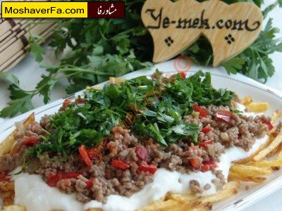اگر برای شام مهمان دارید و نمی دانید چه چیزی درست کنید این رسپی مخصوص مهمان شماست کبابی است که درست کردن آن زمان زیادی نمی خواهد و به آسانی تهیه می شود اگر بی صبرانه می خواهید این کباب را یاد بگیرید در ادامه آموزش تصویری آن را ببینید مواد لازم: گوشت چرخ کرده 250 گرم پیاز 1 عدد سیر 2 حبه فلفل قرمز 1 عدد کره 2 قاشق گوجه فرنگی 1 عدد ماست 1 کاسه نمک و فلفل رویه: جعفری طرز تهیه: در یک تابه مقدار کمی روغن بریزید پس پیاز و سیر ریز خرد شده را به روغن بریزید و 5-6 دقیقه تفت بدهید فلفل قرمز را مکعبی خرد می کنیم با پیازها 3 دقیقه دیگر تفت می دهیم و گوشت چرخ کرده را می ریزیم با همه مواد 5 دقیقه تفت می دهیم در آخر گوجه فرنگی های مکعبی خرد شده , نمک و فلفل را ریخته و خوب تفت می دهیم. در یک تابه دیگر سیب زمینی ها را کبریتی خرد کرده و در روغن داغ سرخ میکنیم ودر ظرف مورد نظر سیب زمینی ها را می ریزیم سپس رویش ماست هم زده شده را میریزیم و رویش مواد گوشتی را ریخته وروی آن جعفری خرد شده می ریزیم