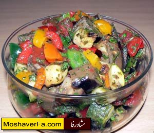 ● مواد لازم: ▪ دو عدد گوجهفرنگی ▪ فلفل سبز و قرمز و زرد از هرکدام نصف فلفل (اگر فلفل رنگی نداشتید دو عدد فلفل سبز) ▪ دو عدد کدو سبز ▪ دو عدد بادمجان (بادمجان درشت یک عدد) ▪ دو قاشق غذاخوری سرکه ▪ سه قاشق غذاخوری روغن زیتون ▪ دوقاشق غذاخوری مرزنجوش خرد شده(marjoram) ▪ دوقاشق غذاخوری آویشن ▪ یک قاشق غذاخوری جعفری خرد شده ● طرزتهیه : بادمجان و کدو و گوجه فرنگی را به مدت دو ساعت در روغن زیتون میخوابانیم. سپس آنها را در باربکیو یا فر کبابی میکنیم تا پخته شوند. بعد آنها را به قطعات کوچک خرد میکنیم همراه با فلفلهای خرد شده در ظرف میریزیم و مرزنجوش و جعفری و اویشن و نمک و سرکه را به آنها اضافه کرده و خوب هم میزنیم. این سالسا به همراه غذاهای گوشتی خورده میشود.