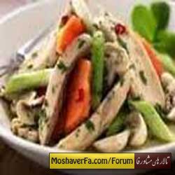 مواد لازم: گوشت مرغ پخته و خلال شده 2/1و1 پیمانه کرفس خلال شده 1 پیمانه هویج خلال شده 2/1 پیمانه فلفل دلمه خلال شده 2/1 پیمانه قارچ ورقه شده 1 پیمانه ذرت پخته شده 2/1 پیمانه پیاز سرخ شده 1 قاشق سوپخوری گوجه فرنگی تخم گرفته و خلال شده 2/1 پیمانه کره 1 قاشق غذا خوری سویا سس مقداری طرز تهیه : روغن را داخل تابه ریخته کمی که گرم شد،گوشت و پیاز سرخ شده را با هم تفت دهید، آن گاه گوشت و پیاز رااز داخل تابه بردارید و به جای آن فلفل دلمه ای را کمی تفت داده ، هویج و کرفس رادر تابه ریخته کمی همزده، سپس قارچ ورقه شده و گوجه فرنگی خلال شده را به مواد اضافه کنید وکم کم هم بزنید هنگامی که همه ی مواد پخته شد ، گوشت و پیاز و سویاسس را به مواد افزوده کمی تفت بدهید. این غذا فقط باتفت دادن پخته می شود. از گوشت فرمز یا ماهی یا میگو نیز می توان استفاده کرد ، فقط حرارت باید تند و یکنواخت باشد