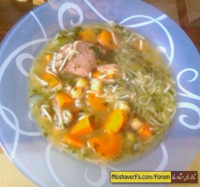 مواد لازم برای 3-4 نفر : ماهیچه گوسفندی که حداقل 100 گرم گوشت خالص داشته باشد یک عدد پیاز متوسط یک عدد هویج نسبتا بزرگ یک عدد ورمیشل دو مشت ( دو استکان پر ) جعفری خرد شده دو استکان پر نخود یک استکان پر ( اگر سرفه می کنید ) طرز تهیه : گوشت را با پیاز خرد شده و نخود و دو کاسه بزرگ آب از صبح بگذارید تا 2-3 ساعت کاملا بپزد.گوشت در این سوپ در نهایت باید در دهان آب شود. یادتان باشد قرار است مریضی این را بخورد که حال جویدن زیاد ندارد! نخود قابل حذف است اما در طب سنتی آب نخود جوشیده برای سرفه خیلی مفید است. در نیم ساعت آخر پخت هویج را نگینی درشت خرد کرده به گوشت اضافه کنید تا بپزد . ( بچه که بودم مامانم هویج را حلقه های نازک خرد می کرد و در این سوپ می ریخت ). هویج که پخت ورمیشل را همراه نصف قرص استاک مرغ ( من در همه سوپها از استاک مرغ بجای نمک استفاده می کنم ) به سوپ اضافه کنید و بعد از 15-20 دقیقه جعفری خرد شده را اضافه کنید. پس از یکی دوجوش سوپ را سرو کرده با آبلیموی تازه میل نمایید. رنگ و عطر این سوپ و البته ویتامین ث فراوانش از جعفری است. من که پر جعفری اش را دوست دارم. در ضمن جعفری بیش از یکی دوجوش که بزند رنگش تیره می شود و خواصش کم. از آب قلم در این سوپ می توانید استفاده کنید ، آب قلم را در مواقع عجله می توانید برای درست کردن این سوپ بکار ببرید. البته با ماهیچه اش خوشمزه تره .