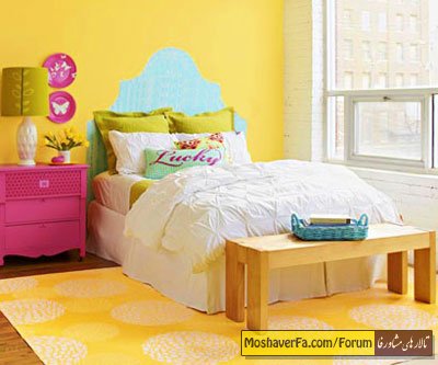 اگر می خواهید اتاق خوابی با دکوراسیون رنگی و خاص داشته باشید با ما همراه شوید. در اینجا از رنگهای روشن و ورزشی برای طراحی و رنگ وسایل اتاق خواب استفاده شده است که به جرات می توان گفت چنین طرح و رنگی با سلیقه هر کسی خوشایند می باشد . کل کاری که انجام داده ایم! در کل ، همانطور که در تصویر زیر می بینید ما بعد از طراحی و دکوراسیون این اتاق خواب به این مدل رسیده ایم که در نهایت بسیار حذاب و دیدنی می باشد و در زیر برایتان یکی یکی مراحل را به همراه تصاویر مربوطه توضیح داده ایم که با بهره گیری از آن می توانید اتاق خوابی مانند تصویر زیر داشته باشید. رنگ های استفاده شده در کل باید گفت برای رنگ آمیزی و چیدمان این اتاق خواب زیبا از ترکیب رنگ های سفید و سبزو زرد و آبی و صورتی استفاده کرده ایم. رنگ زرد آفتابی برای دیوارها تا اتاق ما از جذابیت بیشتری برخوردار باشد و رنگ سبز هم مانند روزهای زیبای بهاری و رنگ آبی به مانند آرامشی که در رنگ آسمان و دریا وجود دارد و استفاده از رنگ صورتی برای ایجاد زیبایی و جذابیت بیشتر پیشنهاد شده است. شابلون لوازم جانبی و شخصی روی وسایل و لوازم شخصی شابلون های زیبایی زده و طرح های زیبایی میزنیم .مثلا کمد طبقاتی اتاقمان را در نظر گرفته و روی یکی از کشوهای آن طرح های زنبوری می زنیم و سپس با قلم مو روی آن رنگ صورتی می زنیم و در نهایت می گذاریم تا خشک شود و سپس با کمک قلم موی نازکی روی آن یک علامت اختصاری از نام خود را می نویسیم و در آخر روی آن اسپری ثابت کننده می زنیم و اجازه می دهیم تا مدتی بماند تا کاملا خشک شود. چراغ مطالعه شخصی یک چراغ مطالعه سبز رنگ و جمع و جور را تهیه می کنیم و آن را روی میز صورتی کنار تخت قرار می دهیم و از آن به هنگام احتیاج به نور در شب ها و یا به هنگام مطالعه استفاده می کنیم. رنگ آمیزی چراغ مطالعه در ابتدا کل آن را به رنگ سبز رنگ آمیزی می کنیم و سپس روی آن با قلم مو یک ساقه کشیده و آن را پر رنگ می کنیم . اضافه کردن برگها با استفاده از شابلون در اطراف ساقه چند برگ زیبا را طرح می زنیم و سپس داخل آنها را با رنگ سبزی مخالف رنگ سبز زمینه رنگ می کنیم و به این ترتیب طرحی زیبا از روزهای بهاری روی آن درآورده ایم. تزئینی روی دیوار یک ظرفی مانند یک بشقاب را در نظر می گیریم و در ابتدا کل آن را رنگ صورتی می زنیم و سپس با شابلون طرح هایی از مدل پروانه روی آن در می آوریم و داخل آنها را سفید می کنیم و آن را به دیوار آویزان می کنیم . بالش ها به غیر از بالش های اصلی یک بالش تک را در نظر می گیریم و روی آن یک طرح بسیار خاص و سفارشی در می آوریم . درست کردن این بالش در ابتدا باید یک تکه پارچه ی طرح دار را در نظر بگیریم و آنرا به اندازه ی 40 در 24 برش زده و بالش را داخل آن کرده وآنرا بدوزیم. طرح پارچه ای که ما در نظر گرفته ایم به مانند تصویر زیر و دو رنگ می باشد .با استفاده از قلم مو و رنگ سفید روی آن یک طرحی از یک نوشته می کشیم. نقاشی کردن نوشته نوشته ای را که با رنگ سفید از قبل روی بالش انداخته بودیم و جای آن کاملا مشخص می باشد را در نظر می گیریم و به آرامی و با دقت روی آن را با رنگ صورتی جذاب پررنگ می کنیم و به این ترتیب نوشته ی دلخواهمان را روی بالش طرح زده ایم و در نهایت بالشی بسیار خاص و سفارشی درست کرده ایم. کنسول و آینه گوشه ای از اتاق خواب را در نظر گرفته و یکدست کنسول و آینه و یک صندلی تک و یک آباژور را در آنجا قرار می دهیم که بهتر است در انتخاب آن و رنگی که برای آن در نظر می گیریم بسیاردقت کنیم و پیشنهاد می شود رنگ این کنسول و آینه هماهنگ با رنگ تاج بالای تخت باشد و صندلی کنار آن را هم چوبی تهیه می کنیم و روی آن را بالش های زیبایی برای راحت تر نشستن قرار می دهیم.در مقابل دستگیره ی کشوهای کنسول را هم چوبی تهیه می کنیم تا همه چیز با هم ست باشد و هماهنگی وجود داشته باشد. بالش روی صندلی برای بالش روی صندلی از پارچه ای خاص استفاده می کنیم که رنگ آن صورتی باشد و سپس با استفاده از شابلون روی آن طرحی خاص می زنیم و آنرا هم زر
