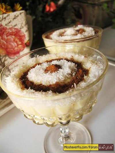مواد لازم: شیر ۱ لیوان آرد برنج ۲ قاشق سوپخوری زرده تخم مرغ ۱ عدد وانیل کمی کره ۲۵ گرم شکر ۴ قاشق سوپخوری آب پرتقال (با تکه های پرتقال) نصف پیمانه طرز تهیه : همه مواد را به غیر از آب پرتقال با هم مخلط کنید تا به غیر از کره همه با هم یکی شوند بعد روی حرارت میگذاریم و مداوم هم میزنیم تا مواد سفت شود بعد از روی حرارت بر می داریم و آب پرتقال را اضافه می کنیم و هم میزنیم . در ظرف مورد نظرتان بریزید و با دارچین و پودر نارگیل تزئین کنید .