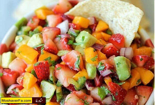 این سالاد خوشمزه برای جوانه های چشایی خوبست . اگر به دنبال یک سالاد شیرین و سالم هستید، این دستور غذا ایده آل شما می باشد. این دستور فوق العاده آسان در هر زمان که احساس گرسنگی کردید میتوانید بعنوان میان وعده بخورید 1/2 عدد آووکادو 2 عدد انبه رسیده و پوست کنده 1 عدد لیمو ترش 1/2 فنجان توت فرنگی مکعبی خرد شده 1 عدد فلفل سبز، خرد شده 1 فنجان برگ گشنیز، خرد شده 1 عدد پیاز قرمز 2 قاشق غذاخوری سس فلفل قرمز سیردار آماده سازی: اول، انبه ها را به قطعات مساوی برش داده. آووکادوها را نیز به همین ترتیب برش میدهیم. فلفل سبز دلمه ای خرد شده، توت فرنگی، و پیاز قرمز تکه تکه کرده. گشنیز خرد شده. مخلوط آب لیمو و سس فلفل قرمزسیردار همه را در یک کاسه کوچک ریخته خوب ترکیب میکنیم در یخچال میگذاریم تا کمی سرد شود