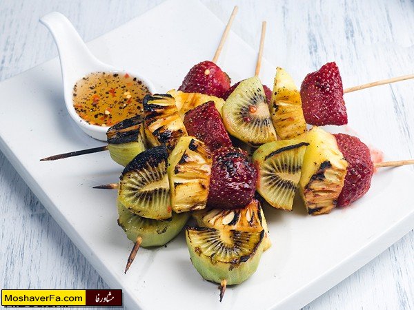 – ما همواره مواد غذایی مانند سبزیجات، و یا گوشت را کبابی می کنیم ، ولی آیا تاکنون شنیده اید که میوه را کبابی کنند و آیا این کار را انجام داده اید. اگر دوست دارید دستور متفاوتی را یاد بگیرید در این بخش میوه کبابی را آموزش می دهیم که با آبلیو و عسل سرو می شود و هم آسان است و هم سریع آماده می شود. زمان آماده سازی: 10 دقیقهزمان پخت: 5 دقیقهتجهیزات مورد نیاز: باربیکیو، سیخ کباب مواد لازم:• 2 عددکیوی• 8 عددتوت فرنگی• ½ عددآناناس • 2 قاشق غذاخوری عسل • 2 قاشق غذاخوری آبلیمو• نمک و فلفل برای مزه دار کردن طرز تهیه • توت فرنگی، کیوی و آناناس را برش داده• در یک کاسه مخلوط عسل و آب لیمو ریخته سپس. فلفل قرمز و نمک بریزید• چند قطعه از توت فرنگی، آناناس، و کیوی را در سیخ چوبی قرار دهید• در باربیکیو قرار دهید وقتی کبابی شد آماده است• ، با سس عسل و لیمو سرو کنید