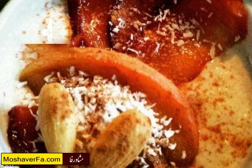 – این رسپی برای رژیمها و کسانی که به دنبال شیرینی های رژیمی هستند بسیار مناسب است شیر سویا 2 لیوان آرد جو 3 قاشق دارچین 1 قاشق مربا نارگیل رنده شده 1 قاشق مرباخوری مواد لازم برای رویه: میوه دوشاب 1 قاشق مربا دارچین نارگیل رنده شده بادام طرز تهیه: شیر, آرد جو, نارگیل و دارچین را در غذا ساز ریخته تا هم زده شود و در یخچال قرار دهید تا سرد شود اگر مایه آبکی باشد طبیعی است چون آرد جو داخش پف می شود. میوه هار ا برش داده و در تابه تفلون دارچین و دوشاب ریخته و کارhملی می کنیم اکنون به دلخواه تزئیین کنید.