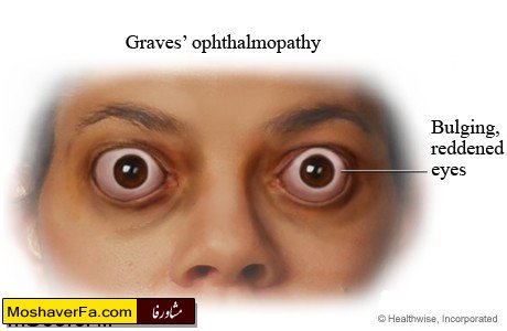 برآمدگی به بیرون از چشم اولین نشانه بیماری گریوز است است . اگزوفتالموس بزرگ شدن ماهیچه ها ی چشم و ادم بعلت تورم به دلیل مایع انباشته در بافت اطرافو در مدار چشم ( حدقه چشم ) است. تحرکت چشم ها، به سمت بالا است. افتالموپاتی گریوز می تواند فقط یک چشم (یک طرفه ) را درگیر کند. شامل هر چند در غالب موارد شامل هر دو چشم ( دو طرفه) هم میشود تعداد اندکی از بیماران مبتلا به گریوز دچار علائم چشمی مشخصی به نام افتالموپاتی گریوز یا بیماری چشمی تیروئیدی می گردند مبتلایان علاوه بر علائم هیپرتیروئیدی ممکن است دچار ادم جلوی تیبیا و به ندرک کلابینگ انگشتان دست شوند. افتالموپاتی ممکن است قبل از دیگر علائم تیروتوکسیکوز ایجاد شود و حتی در بیمارانی رخ دهد که هرگز دچار هیپرتیروئیدی نمی گردند. این بیماری در اثر درمان با ید رادیواکتیو ( به ویژه اگر بیمار سیگاری باشد ) تشدید می گردد. علائم بالینی : بیماران ممکن است با علائم غیر اختصاصی نظیر خشکی چشم ، ناراحتی و یا برآمدگی چشم مراجعه نمایند. فعالیت بیماری افتالموپاتی گریوز را به شکل جدول تقسیم بندی نموده است. رتراکسیون پلک : رتراکسیون پلک به خصوص اگر با اگزوفتالمی همراه باشد پاتوگنومونیک بیماری تیروئید است رتراکسیون پلک می تواند یکطرفه یا دو طرفه و در پلک فوقانی یا تحتانی باشد این حالت اغلب با میوپاتی محدود کننده همراه است که رکتوس تحتانی را درگیر می کند و باعث اختلال در بالا رفتن چشم می شود. پاتوژنز رتراکسیون پلک متفاوت است و می تواند شامل تحریک بیش از حد سمپاتیک و انفیلتراسیون التهابی مستقیم عضله بالابرنده باشد. بیشترین عضله خارجی چشم که در بیمار گریوز چشمی دچار میوپاتی محدود کننده می شود عضله رکتوس تحتانی است. اگزوفتالمی : شدت اگزوفتالمی می تواند بسیار متغیر باشد اندازه گیری با اگزوفتالمومتر هرتل یا کران ( hertel or krahn ) از خفیف ( کمتر از 24 میلی متر ) تا شدید ( 28 میلی متر یا بیشتر ) متغیر است . معمولا نامتقارن است. می تواند یکطرفه باشد. افتالموپلژی : شایع ترین یافته، محدودیت دربالا بردن چشم است که عمدتا به خاطر گیر افتادن عضلات رکتوس تحتانی رخ میدهد . با اندازه گیری فشار داخل چشم حین بالا بردن چشم ، گیر افتادگی عضلات مشخص می گردد ( فشار داخل چشم بالا می رود) اغلب یک محدودیت خفیف در حرکات چشمی در همه جهات وجود دارد . بیمار از دو بینی شکایت دارد . این حالت به درمان با استروئید جواب می دهد در صورت عدم بهبود بعد از 6 تا 12 ماه جراحی عضلات انجام می شود. تغییرات شبکیه و عصب اپتیک : فشار وارده از طرف محتویات اربیت بر کره چشم ممکن است موجب افزایش فشار داخل چشم و پیدایش خطوط ( استریا ) بر شبکیه و کوروئید شود . ممکن است نوروپاتی اپتیک مرتبط با گریوز در اثر تحت فشار قرار گرفتن یا ایسکمی عصب اپتیک در محل عبور آن از اربیت ( به ویژه در آپکس اربیت ) روی دهد. تغییرات قرنیه : در بعضی بیماران ، ممکن است یک کراتوکنژنکتیویت در ناحیه فوقانی لیمبوس دیده شود که اختصاصی بیماری تیروئیدی نیست. پاتوژنز : بیماری گریوز ، عضلات خارج چشمی ، چربی اربیت ، غدد اشکی و بافت همبندی بینا بینی اربیت را تحت تاثیر قرار می دهد . افتالموپاتی درد دردناک ، احساس خرد کننده در پشت یا روی کره چشم احساس درد در زمان نگاه به طرف بالا ، اطراف و یا پایین قرمزی قرمزی پلک ها قرمزی ملتحمه به شکل منتشر تورم کموزیس (ادم ملتحمه) تورم کارونکل ها ادم پلک ها افزایش پروپتوز به مقدار 2 میلی متر یا بیشتر در یک پریود زمانی 1 تا 3 ماهه اختلال در عملکرد کاهش حدت بینایی در یک یات عداد بیشتری از خطوط چارت اسنلن در مدت 1 تا 3 ماه کاهش حرکات چشم در تمام جهات به مقدار 5 درجه یا بیشتر در طی 1 تا 3 ماه این سیستم بر اساس نشانه های التهابی طراحی شده است درد (dolor) قرمزی (rubor) تورم (tumor) و اختلال عملکرد به ازا هر یک از نشانه ها یک امتیاز در نظر گرفته می شود مجموع این امتیازات نشاندهنده میزان فعالیت بیماری می باشد. گریوز یک بیماری اتوایمیون است ؛ معمولا مبتلایان به گریوز دارای 