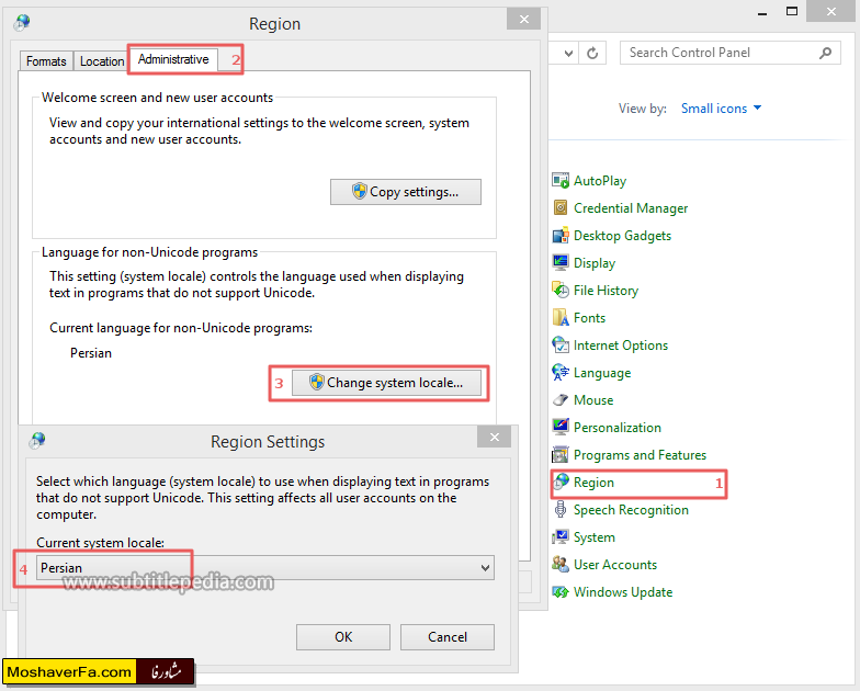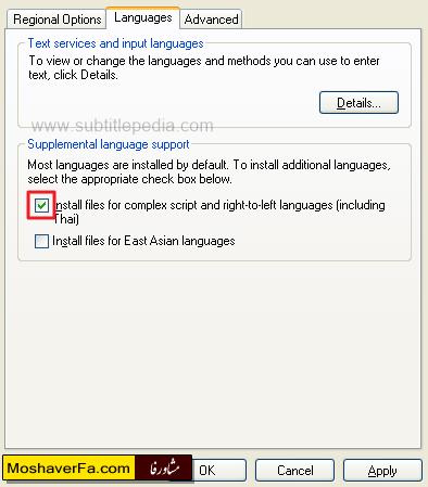 اگر زیرنویس های فارسی در هنگام پخش به شکل علامتهای عجیب و فونت ناخوانا نمایش داده میشود, این آموزش مشکل شما را برطرف خواهد نمود روش اول: (دائمی) برای حل این مشکل در ویندوزهای 7 و 8 به مسیر زیر رفته: Start -> Control Panel -> Region -> Administrative -> Change System Local آن را به Persian تغییر داده سپس کامپیوتر را Restart کنید. برای اینکه در هنگام اجرای فیلم زیرنویس شما هم همزمان اجرا شود باید اسم زیرنویس با اسم فایل تصویری یکی باشد مثلاً: Green Mile [1999] HD.mkv Green Mile [1999] HD.srt در Windows XP مسیر به صورت زیر است: Start -> Control Panel -> Region and Language -> Advanced -> Change System Local آن را به Farsi تغییر داده کامپیوتر را Restart کنید. در ویندوز XP پیش از مرحله بالا، در تب Languages فعال بودن کادر مشخص شده در تصویر زیر را بررسی کنید و در صورت فعال نبودن تیک آن را زده و سپس دکمه Apply را بزنید و پیغام نمایش داده شده را تایید کنید (برای این مرحله نیاز به دیسک ویندوز یا وجود فایل های نصبی ویندوز در کامپیوتر خود دارید). سپس کادر زیر نمایش داده میشود که در این مرحله برای کپی فایلها میباید دیسک ویندوز را در درایو کامپیوتر قرار دهید ------------------------------------------------------------ در برنامه های پخش کننده از فونت هایی استفاده نمایید که قادر به نمایش حروف فارسی هستند مانند Tahoma یا Segoe UI جهت تغییر دادن فونت ابتدا به بخش تنظیمات برنامه رفته, سپس طبق تصاویر زیر فونت نمایش زیرنویس را تغییر دهید. KMPlayer برای رفتن به بخش تنظیمات روی پنجره برنامه راست کلیک کرده و سپس از منوی option گزینه preferences را کلیک و یا از کلید کمکی F2 استفاده کنید PotPlayer برای رفتن به بخش تنظیمات روی پنجره برنامه راست کلیک کرده و گزینه preferences را کلیک و یا از کلید کمکی F5 استفاده کنید روش دوم: زیرنویس را با Notepad باز کرده و سپس از روی گزینه ی File گزینه ی …Save as را انتخاب کنید و دوباره زیرنویس را با پسوند srt. ولی این مرتبه در گزینه ی Encoding بجای گزینه ANSI گزینه UTF-8 یا Unicode را انتخاب کنید. روش سوم: در نرم افزار Kmplayer به مسیر زیر بروید: Option -> Preferences -> Subtitle Processing -> Font Style و در قسمت Charset گزینه Arabic را انتخاب کنید. در مجموع روش اول راه حل دائمی برای مشکل است، ولی در صورت مشکلی می توانید از روشهای دوم و سوم استفاده کنید. تلویزیون ها و دستگاه های پخش کننده با استفاده از روش دوم آموزش، انکدینگ زیرنویس را بین Unicode - ANSI و UTF-8 تغییر داده سپس فایل زیرنویس را همنام با فیلم و در کنار آن قرار داده و تست کنید که تلویزیون یا دستگاه های پخش کننده تان با کدام انکدینگ سازگاری دارد. لازم به ذکر است برخی دستگاه ها از زیرنویس های فارسی پشتیبانی نمیکنند. سیستم عامل آندروید در دستگاه هایی با سیستم عامل آندروید میتوانید از برنامه MX Player جهت پخش استفاده کنید. و در صورت مشکل در نمایش زیرنویس فارسی به قسمت تنظیمات برنامه رفته و در بخش Subtitle گزینه Character Encoding را بروی Arabic cp1256 و یا Auto Detect قرار دهید. همچنین برنامه های زیر نیز قابلیت تغییر انکدینگ زیرنویس را دارا میباشند Change Encoding Subtitle Editor Free Easy Subtitles