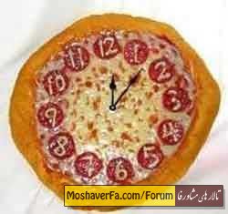مواد لازم به اندازه سه تا چهار وعده : خمیر آماده مخصوص پیتزا به قطر ۲۰ سانتی متر رب گوجه فرنگی یا سس پیتزا ۳ قاشق غذا خوری گوجه فرنگی ۲ عدد پنیر پیتزا رنده شده ۷۵ گرم سبزی معطر ( خشک ) به مقدار اندک فلفل دلمه ای سبز ۱ عدد هویج ۱ عدد کالباس ساده ۱ ورق ضخیم طرز تهیه : 1- فر را از قبل ، با درجه حرارت 220 درجه سانتی گراد یا 425 درجه فارنهایت گرم کنید . خمیر آماده پیتزا در سینی فر قرار دهید و روی آن رب گوجه فرنگی بریزید . گوجه فرنگی ها را خرد کرده ، روی این خمیر بچینید . سپس پنیر رنده شده و سبزی معطر خشک را روی آن بپاشید . 2- این خمیر را با محتویاتش مستقیماً داخل فر بگذارید تا به مدت 12 دقیقه پخته شود 3- فلفل دلمه ای را از وسط نصف کرده ، تخمه های ان را بیرون آورید و سپس از این فلفل دلمه ای به شکل اعداد 3 ، 6 ، 9 ، و 12 جدا کنید (می توان از قالب های کوچک مخصوص اعداد استفاده کرد) هویج را نیز پوست گرفته ، به صورت ورقه های نازک ببرید . سپس اعداد 1 ، 2 ، 4 ، 5 ، 7 ، 8 ، 10 ،و 11 را از آن جدا کنید . 4- برای عقربه های ساعت از کالباس ساده ، دو نوار به طول 5/7 سانتی متر ببرید . 5- این پیتزای تزیین شده به شکل ساعت را در ظرف غذای مخصوص کودک قرار دهید . بگذارید تا کمی سرد شود ، سپس برش های مثلثی شکل روی آن ایجاد کنید ، یعنی روی سطح این پیتزا یک برش ضربدری بزنید تا پیتزا به چهار قسمت مساوی تقسیم شود . سپس یک قسمت از آن را به کودک بدهید تا بخورد . نکته : اگر بخواهید این پیتزا را به اندازه کوچک تر درست کنید ، می توانید از نصف این خمیر پیتزا استفاده کنید . بقیه مراحل طرز تهیه طبق دستور فوق می باشد . فقط برای پخت ، آن را در فر بگذارید تا پنیر ذوب شود . اعداد ار کوچک تر ببرید و عقربه ها را نیز از کالباس ساده ورقه نازک انتخاب کنید .