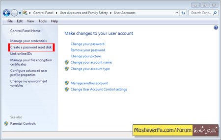 چنان چه از کاربران ویندوز 7 و یا 8 هستید میتوانید با ساختن یک usb موسوم به Reset disk به منظور پیشگیری و بازیابی سیستم استفاده کنید. برای شروع انجام کار لازم است وارد کنترل پنل شوید. سپس Creat a password Reset disk را از قسمت User accounts انتخاب کنید. پس از باز شدن پنجره جدید روی Next کلیک کنید در مرحله بعد دستگاه USB را انتخاب کنید . پس از انتخاب دستگاه و زدن Next، رمز عبور مورد نظرتان را وارد کنید. چنانچه در قسمت رمز عبور هیچ رمز عبوری نداشت Next را بزنید. مجددا بر روی Next کلیک کرده و در آخر Finish را بزنید. با انجام این کار فلشتان برای بازیابی پسوردتان آماده شده است. برای استفاده از USB مجددا ویندوزتان را راهاندازی کنید زمانی که سیستمتان بالا آمد دستگاه USB را به سیستمتان وصل کنید. پس از وارد کردن رمز ok را بزنید و بعد بر روی Reset password کلیک کنید. بعد از زدن بر روی کلید Next و سپس Finish را بزنید.