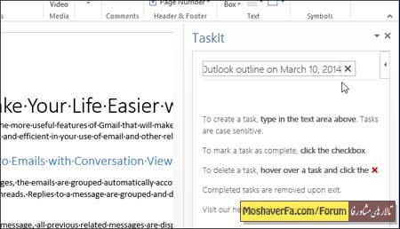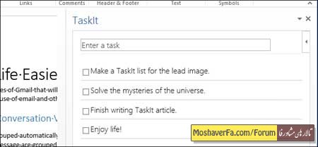 برای پیگیری و یادآوری کارهایتان، راه های مختلفی وجود دارد، این کار را می توانید از طریق کامپیوتر و یا موبایل و یا در فضای آنلاین انجام دهید و یا می توانید از روش های قدیمی ای مانند نوشتن کارها بر روی یک تکه کاغذ و زدن آن به یخچال استفاده کنید. اگر شما از نرم افزار word استفاده می کنید، جالب است بدانید که این کار را می توانید با این برنامه نیز انجام دهید. در اینجا ما اپلیکیشن رایگان TaskIt که برای word نوشته شده است را به شما معرفی خواهیم کرد. این اپ به شما این امکان را می دهد که یک لیست از کارهایتان را به صورت مستقیم در word وارد کنید و به صورت خودکار ذخیره خواهد شد. زمانی که شما در حال استفاده از word هستید، می توانید کارهای جدیدی را به لیست کارهایتان اضافه کنید و زمانی که ورد را ببندید، این لیست به صورت خودکار ذخیره خواهد شد و وقتی دوباره ورد را باز کنید این لیست را مشاهده خواهید کرد. نصب برنامه قبل از هر کاری مطمئن شوید که برنامه word در حال اجرا نیست و اگر در حال اجرا است آن را ببندید به صفحه این نرم افزار در فروشگاه آفیس بروید و بر روی دکمه Add کلیک کنید. برای نصب یک نرم افزار از فروشگاه آفیس، شما باید یک حساب مایکروسافت (Live, Hotmail) و یا غیره داشته باشید. وارد حسابتان شوید و اپ را دانلود کنید. در صفحه بعد مایکروسافت به شما یک پیام حاوی کارهایی که اپ قادر به انجام آن می باشد را نشان می دهد. بر روی Continue کلیک کنید. در این مرحله یک پنجره نشان داده خواهد شد که روند دانلود را نشان می دهد و از شما می خواهد که مرورگرتان را نبندید. پس از این مرحله یک صفحه حاوی دستورالعمل نحوه استفاده از اپ ها در آفیس باز خواهد شد. در این مرحله شما می توانید مرورگرتان را ببندید. در برنامه word به سربرگ (تب) insert بروید و در قسمت apps بر روی My Apps کلیک کنید. در پنجره باز شده بر روی TaskIt کلیک کنید و سپس بر روی دکمه Insert کلیک کنید. نکته: با کلید بر روی فلش رو به سمت پایین در کنار My Apps شما می توانید به آخرین اپ هایی که استفاده کرده اید دسترسی داشته باشید. این اپ در کنار پرونده جاریتان و در سمت راست آن و یا در یک پرونده جدید اجرا خواهد شد. برای اضافه کردن یک وظیفه و یا یک کار به لیست، در جعبه ویرایشگر متن، یک توصیف از کارتان را بنویسید و enter کنید. این کار به همراه یک مربع کوچک در کنارش به لیست اضافه می شود و زمانی که آن کار را انجام دادید می توانید به وسیله آن مربع یک تیک در کنار آن بگذارید. زمانی که شما یک تیک در کنار یک کار بگذارید، آن و ظیفه خط می خورد و دفعه بعدی که شما این اپ را اجرا کنید، آن کار را مشاهده نخواهید کرد. اگر می خواهید آن کار را همین الان حذف کنید کافی است بر روی علامت ضربدر قرمز رنگ کلیک کنید. اگر می خواهید TaskIt را ببندید بر روی علامت ضربدر در بالای پنل مربوط به این اپ کلیک کنید. لازم به ذکر است که نیازی نیست که کارهایتان را ذخیره کنید و این اپ به صورت خودکار این کار را انجام می دهد پس بدون هیچ نگرانی ای وردتان را ببندید. کارهای مشابه را نمی توانید چند دوباره اضافه کنید. هر کار باید شرح منحصر به خودش را داشته باشد. امکان ویرایش یک کار وجود ندارد و اگر شما می خواهید یک کار را ویرایش کنید کافی است آن را حذف کنید و دوباره وارد کنید.