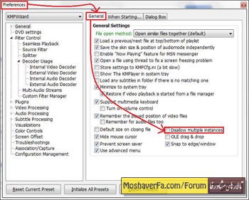 در صورتی که از نرمافزار KMPlayer برای اجرای فایلهای صوتی و تصویری خود استفاده میکنید حتماً میدانید که به وسیلهی این نرمافزار تنها امکان اجرای یک فایل در آنِ واحد وجود دارد. بدین معنی که اگر یک فایل در حال اجرا باشد و اقدام به باز کردن یک فایل دیگر توسط این نرمافزار کنید، اجرای فایل قبلی متوقف شده و فایل جدید اجرا میشود. در این ترفند قصد داریم به نحوهی اجرای اجرای همزمان چندین فایل در KMPlayer بپردازیم. بدین منظور: ابتدا KMPlayer را اجرا کنید. سپس بر روی کلید F2 کلیک کنید تا پنجرهی Preferences باز شود (راه دیگر برای این کار راست کلیک بر روی صفحه و انتخاب Preferences از منوی Options است). حال از قسمت سمت چپ پنجره بر روی اولین آیتم یعنی General کلیک کنید. اکنون از قسمت سمت راست پنجره، تیک گزینهی Disallow multiple instances را بردارید. سپس بر روی دکمهی Close کلیک کنید. هماکنون میتوانید با اعمال این تنظیم، بیش از یک فایل را به طور همزمان اجرا کنید.