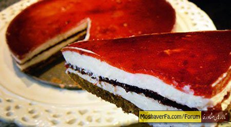 این چیز کیک آلبالویی با پایه بیسکویت است. _ برای لایه زیرین چیز کیک به 250 گرم بیسکویت پودر شده شکلاتی و 125 گرم کره ذوب شده نیاز داریم. بیسکویت ها را در غذاساز پودر کنید و به همراه کره ذوب شده مخلوط کنید تا پایه چیز کیک را به ما بدهد، در قالب کمربندی ریخته و با پشت یک قاشق صاف کنید، (در صورت نبود قالب کمربندی می توان کف یک قالب گرد ساده را کیسه فریزر پهن کنید) _ برای لایه دوم و میانی نیازبه 400 گرم، پنیر خامه ای و300 گرم، خامه فرم گرفته و50 گرم شکرداریم. خامه فرم گرفته قنادی را با پنیر خامه ای و شکر با همزن بزنید تا کرم لطیفی به شما بدهد، نصف کرم را روی پایه بیسکویتی چیزکیک می ریزیم و صاف می کنیم. _ برای لایه سوم 300 گرم آلبالو پوره شده ( هسته های آلبالو را جدا کرده و داخل مخلوط کن ریخته و میکس کنید ) را به همراه 125 گرم شکر و1 قاشق سوپخوری آبلیمو و ¼ پیمانه آب در یک قابلمه روی حرارت قرار دهید تا کمی قوام بیاید و آب آن جمع شود، سپس خاموش کنید و دو قاشق سوپخوری پودر ژلاتین را به آن بیفزایید، نصف این مایه را روی کرم پهن کنید. _ لایه چهارم را از مواد کرمی مجدد بریزید و لایه آخر را نیز دوباره از مایه آلبالو پوره شده ،روی مایه کرمی بریزید.