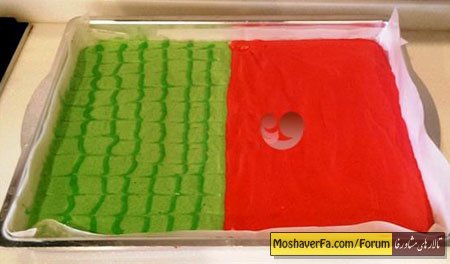 با این رولت هندوانه از عزیزان تان در شب یلدا پذیرایی کنید. درست کردن این رولت هندوانه برای شب یلدا شاید در نگاه اول کمی سخت به نظر برسد، ولی با دستور تهیه ای که در ادامه مطلب مشاهده خواهید کرد، میتوانید با کمی دقت در اندازه مواد و ترتیب آنها، به راحتی رولت را تهیه کرده و از عزیزانتان در شب یلدا پذیرایی کنید ابتدا یک رولت 4 تخم مرغی درست کنید. مواد لازم : تخم مرغ 4 عدد شکر 80 گرم آرد 90 گرم شربت غلیظ 1 قاشق سوپخوری طرز تهیه : زرده تخم مرغ را از سفیده جدا كنید و زرده را با نصفی از شكر و وانیل بزنید تا كرم شود . سفیده تخم مرغ را زده تا فرم بگیرد و بعد شكر را بصورت بارانی به آن اضافه كنید . زرده و سفیده را مخلوط كرده و بعد آرد را روی آن الک می كنیم . اگر دوست دارید روی رولت طلایی شود 1 ق س شربت را در آخر به آن اضافه می كنیم . بعد در سینی 40×30 ریخته و این نكته خیلی مهم است كه سینی فر آخرین طبقه از بالا باشد و درجه فر 220 درجه فقط 8 تا 10 دقیقه قبل از اضاقه کردن آرد، مایه را به دو قسمت مساوی تقسیم کرده؛ به یک قسمت رنگ قرمز و به قسمت دیگر رنگ سبز اضافه کنید. ( من از رنگ مایع استفاده کردم ) بعد آرد را به آرامی با مایه مخلوط کنید. کف سینی را کاغذ روغنی انداخته و سپس مایه قرمز را در یک طرف سینی و سبز را در طرف دیگر بریزید و با قاشق داخل سینی پخش کنید. دو قاشق غذاخوری از مایه سبز را نگه داشته، کمی دیگر به آن رنگ سبز اضافه کنید تا کاملاً تیره شود و سبز پر رنگی داشته باشید. ( تفاوت دو رنگ سبز زیاد باشد که خودش را بیشتر نشان بدهد ) این مایه را داخل قیف بریزید و روی مایه کیک داخل سینی خطوط موازی بکشید و با سیخ چوبی به آن فرم دهید. برای ادامه کار و مراحل بعدی، مانند رولت معمولی عمل کنید. به یاد داشته باشید که روی حوله ( یا کاغذ روغنی ) که رولت را روی آن بر میگردانید، حتما پودر قند بپاشید که رویه رولت کنده نشود. بعد از خامه کشی و چند ساعت استراحت در یخچال، رولت را با چاقوی اره ای برش زده و بعد برای تخم هندوانه شکلات آبکرده را داخل قیف ریخته و روی برش ها میریزیم ( مانند تصویر )