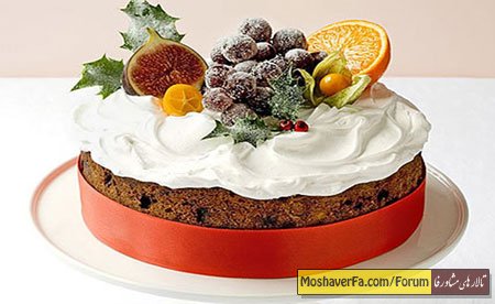 زمان آماده کردن : 20 دقیقه مواد لازم : سفیده تخم مرغ 1 عدد شکر 50 گرم انگور سیاه یک دستهی کوچک برگ بو مقدار کافی کیک میوه گرد 20 سانتیمتری نارنگی 1 تا 2 عدد انجیر تازه رسیده 1 تا 2 عدد کامکوات چند عدد فیسالیس چند عدد روبان قرمز یا طلایی 65 سانتی مواد لازم برای خامهی روی کیک : سفیدهی تخممرغ 2 عدد شکر قنادی 175 گرم طرز تهیه : به آرامی سفیدهی تخممرغ را در یک کاسهی کم عمق زده و شکر را روی یک سینی یا صفحهی پخت بپاشید. انگور و برگهای بو را داخل سفیدهی تخممرغ فرو برده یا از قلمو استفاده نمایید. اضافی آن را تکان داده و با شکر بپوشانید. برای حداقل 10 دقیقه کنار بگذارید تا خشک شود، زمان ایده آل 30 دقیقه است. زمانی که برای تزیین کیک آماده بودید خامهی روی آن را درست کنید. یک کاسهی بزرگ را روی یک قابلمه آب در حال جوش بگذارید. اطمینان پیدا کنید که ته کاسه با آب برخوردی نداشته باشد. سفیدههای تخممرغ و شکر را داخل کاسه ریخته و برای 5 تا 7 دقیقه هم بزنید تا زمانی که یک خامهی غلیظ و شفاف ایجاد شود. زمانی که در حال هم زدن هستید هر چند دقیقه با استفاده از کاردک دور کاسه را تمیز کنید. خامه را روی کیک ریخته و با یک چاقوی لبه تخت، آن را روی کیک پهن کنید. نارنگی، انجیر، و کامکوات ها را نصف کرده و سپس به همراه فیسالیس روی سطح کیک خامهای قرار دهید. یک روبان دور پایهی کیک بسته و تا زمان رسیدن مهمانها کیک را در جایی خنک (اما نه در فریزر) قرار دهید.