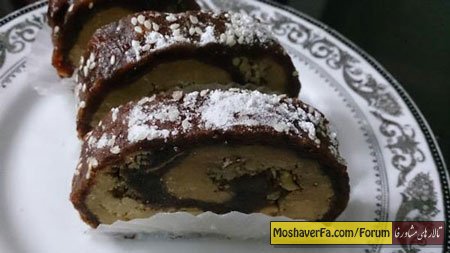 • تعداد: 4 نفر • زمان تهیه و پخت: 40 دقیقه مواد لازم : تخم مرغ 3 عدد آرد 5 قاشق غذاخوری ماست 2.5 قاشق غذا خوری شکر 2 قاشق غذاخوری خرما 20 عدد گردو 5 عدد عسل 2 قاشق غذاخوری کنجد به مقدار لازم زعفران یک قاشق غذاخوری طرز تهیه : 1. تخم مرغ ها در یک ظرف بزنید تا سفیده و زرده یک دست مخلوط شوند. 2. ماست را به تخم مرغ اضافه و هم بزنید. 3. شکر اضافه کنید و هم بزنید. 4. آرد را اضافه کنید و هم بزنید. در این مرحله زعفران را بیفزایید. 5. مخلوط بدست آمده را در تابه که قبلا 3 قاشق روغن در آن داغ شده است در اندازه های دایره به قطر 10 سانتی بریزید تا دو طرف آن سرخ شود. 6. خرما را پوست بکنید و با گردو های خرد شده و کنجد و عسل مخلوط کنید. 7. مواد را داخل سرخ شده ها بریزید و مانند رولت بپیچید. 8. رولت ها را در اندازه های 3 سانتی برش بزنید و در صورت تمایل روی آن کمی دارچین نیز بریزید.