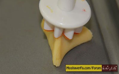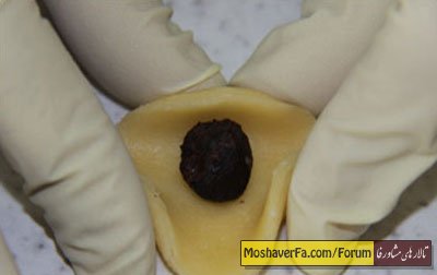 این شیرینی های کوچک بسیار مناسب برای پذیرایی در روزهای عید می باشند. مواد لازم: آرد 90-100 گرم کره 50 گرم پودر قند 30 گرم زرده تخم مرغ 1 عدد نمک یک پنس وانیل نصف ق م رنگ خوراکی مقداری ( یک پیمانه آرد = 125 گرم ) ( یک پیمانه پودر قند = 125 گرم ) مواد لازم برای مغزی شیرینی : کره 50 گرم شکلات تخته ای قهوه ای 100 گرم گردو 50 گرم طرز تهیه : آرد - نمک - وانیل رو با هم مخلوط کرده و کره رو که بصورت مکعب های کوچکی برش زدیم با نوک انگشت با آرد مخلوط می کنیم تا کاملا جذب آرد بشه . بعد زرده و پودر قند رو می افزاییم . خمیر شیرینی رو مخلوط می کنیم، اگه شل بود یه مقدار دیگه آرد به اون اضافه می کنیم ( اگه خمیر باز هم شل بود دیگه آرد اضافه نکنید و خمیر رو در یخچال استراحت بدین ) . نکته خیلی مهم : این خمیر رو نباید خیلی ورز داد چون سفت می شه . سپس خمیر شیرینی رو با وردنه باز کرده و با قالب گرد به قطر حدود 5 سانت اونو قالب می زنیم . برای مغزی این شیرینی ؛ ابتدا شکلات و کره رو روی حرارت کم قرار می دیم و به آرامی هم می زنیم تا شکلات و کره آب بشه. بعد گردوی خرد شده ریخته و مخلوط می کنیم . ( مقدار گردو رو با توجه به ذائقه خودتون می تونید کمتر یا بیشتر کنید ) به اندازه فندق از این مواد برداشته و داخل خمیر قرار می دیم. نکته : درصورتیکه مغزی به اندازه کافی سفت نیست و نمی شه گردش کرد می تونید کمی در یخچال قرار بدین تا سفت بشه. سپس شیرینی رو به شکل زیر اونو می بندیم . یه مقدار از خمیرمون رو با رنگ نارنجی یا قرمز یا رنگ مورد نظر خودتون ،رنگ کرده و بعد قالب می زنیم . سپس گل مورد نظر رو روی شیرینی مون قرار می دیم . بعد روش مروارید نقره ای می ذاریم. نکته : بجای مروارید می تونید از رویال آیسینگ هم استفاده کنید (البته بعد از پخت ) . اگه از مكروفر استفاده مي كنيد : ابتدا با دستور کانوکشن ۲۲۰درجه سانتیگراد دستگاه رو گرم کنید ،بعد دوباره کانوکشن ۲۲۰درجه سانتیگراد و زمان 15 دقيقه .سینی رو روی سه پایه کوتاه قرار دهید . اگه از فر استفاده مي كنيد : فر رو از قبل گرم كنيد بعد۱۸۰ درجه سانتیگراد بمدت 15 دقيقه نکته : مدت زمان پخت شیرینی به فر شما بستگی داره ،پس هروقت زیر شیرینی ها کمی طلایی شد یعنی شیرینی آماده هست .