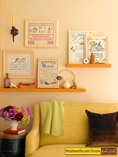 هنگامی که به جست و جوی راه حل های خلاق برای هنر دیواری هستید، خارج از چارچوب فکر کنید و به جای آن از گنج های دست دوم زیبا و بی نظیر استفاده کنید. نشانه های قدیمی نشانه های قدیمی، مثل این نشانۀ تختۀ چندلا از یک شرکت تولید کنندۀ قدیمی، آغازکنندۀ مکالمۀ جالبی در هر اطاقی خواهد بود. رنگ کنده شده و پلت رنگ، قرمز به رنگ ماشین آتش نشانی و ترکیب رنگ قهوه ای مایل به زرد، به این اطاق یک حس قدیمی و شیک می دهد. نشانه های قدیمی را در شرکت های محلی جست و جو کنید. از عکس های خانوادگی استفاده کنید سراسر یک پلکان خالی را به نمایشگاهی از عکس های خانوادگی ارزشمند تبدیل کنید. عکس ها را به رنگ سیاه و سفید یا قهوه ای مایل به سرخ تیره چاپ کنید تا احساسی قدیمی تر به آنها بدهید. از سایزهای تصویر متنوع استفاده کنید و آنها را داخل فرم های زنگ زده یا آنتیک به نمایش بگذارید. تماشای پرندگان تصاویر چاپ شدۀ کلاسیک از پرندگان زیبندۀ هر اطاقی است. از صفحات یک کتاب قدیمی برای یک چشم انداز واقعی استفاده کنید. برای ایجاد یک نمایش کامل، تصاویری را انتخاب کنید که حداقل یک سایه رنگ مشترک داشته باشند. پشت تصاویر را با بریده های روزنامه یا حصیر بپوشانید و آنها را در چارچوبی با گوشۀ بریده قرار دهید. جذبۀ معماری پنجره های قدیمی را که در انبار افتاده اند به عنوان هنر دیواری دوباره استفاده کنید و به جای یک قطعۀ درخشان و جالب روی دیوار آویزان کنید. رنگ پوسته شده به حس قدیمی آینه ای که از یک انباری هلندی نجات یافته است، می افزاید . هنر دیواری دوخته شده الگوهای خیاطی با کوک ضربدری را به نمایشگاه دیواری بی نظیر و بی تکلفی تبدیل کنید. بعضی از آنها را روی قفسه های سیار قرار دهید و تعدادی را روی دیوار آویزان کنید. فرم های مشابهی برای الگوهای خیاطی استفاده کنید تا یک نمایشگاه متحد الشکل ایجاد شود. پنجره های کرکره ای اوراق شده حسی از تاریخ را به هر فضایی با استفاده از لوازم قدیمی ساختمان به شکلی جدید اضافه کنید. پنجره های کرکره ای اوراق شده بهترین روش برای اضافه کردن ساختار و جذابیت به دیوار است. پنجره های کرکره ای بزرگ را پشت قسمتی از مبلمان یا کنار دیوار تکیه دهید. آنتیک های ساحلی گنج های ساحلی خود را در یک ویترین آویخته از دیوار محافظت کنید تا به تعطیلات خود به طور منظم در طول سال اهمیت دهید. برای پیش زمینه، از تکه ای کاغذ دیواری قدیمی استفاده کنید. سپس اسب های دریایی، و تخم حشرات را به کاغذ بچسبانید و جعبه را سوار کنید. ایجاد یک گالری گردان یافته های قدیمی خود را با ساختن یک گالری گردان با روشی بی نظیر به نمایش بگذارید. با آویزان کردن تصویرهای قدیمی مثل این عکس های سگ قدیمی، در طول یک صفحه نمایش تاشو، شما می توانید نمایشگاه خود را بدون سوراخ کردن دیوار تغییر دهید. همچنین یک صفحه نمایش تاشو راهی هوشمندانه برای تقسیم اطاق یا پنهان کردن انباری است. علاقه مند به عکاسی سبک روستایی وپشت دری های قدیمی در کنار هم طبیعی هستند. سعی کنید پشت دری ها را افقی آویزان کنید تا عکس ها، کارت پستال ها، نامه ها، و بریده های روزنامه ها و مجلات را به نمایش بگذارید. اگر سالها نقاشی و فرسایش مانع سفت بسته شدن پنجره های کرکره ای شما برای نگاه داشتن کاغذها می شوند، از تکۀ کوچکی نوار چسب چوب دوقلو برای نگاه داشتن اقلام سرجای خود استفاده کنید. قاب های بشقابی قاب های تزئینی سقف به عنوان قابی برای این بشقاب های چینی نقاشی شدۀ زیبا عمل می کند. وسایل مرکب، که به آسانی در سایزهای متنوعی یافت می شوند، برای خوش نما کردن بشقاب های سقفی چهلچراغی طراحی شده اند. وسایل تزئینی چینی را در حراجی ها پیدا کنید، بشقاب ها را به مرکز قاب های تزئینی بچسبانید و آن را روی دیوار آویزان کنید. برای اطمینان از اینکه بشقاب ها سرجای خود باقی می مانند، یک چسب قوی استفاده کنید تا اتصال خوبی ایجاد نمایید. یک گالری قدیمی ایجاد کنید به هر اطاقی با اثر هنری روستایی یا قدیمی که از حراجی ها تهیه کرده اید، جذابیت بی