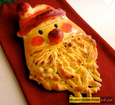 برای کریسمس این نان بابانوئلی را امتحان کنید. برای کریسمس این نان بابانوئلی که را به کودکان تان هدیه دهید. طرز تهیه : ابتدا خمیری ساده مانند تمام خمیرهای نان درست کنید. سپس مانند تصویر تکه از خمیر را به صورت مثلث کشیده که گوشه های آن گرد شده است درست کرده و با وردنه پهن کنید. تکه های دیگر از خمیر را به صورت نیم دایره با وردنه پهن کرده و با قیچی نوارهای باریکی ببرید. این قسمت را به پایین قسمت مثلثی چسبانده و با دست به ریش های بابانوئل فرم دهید. برای بینی بابانوئل از یک تکه خمیر گرد و برای چشم های کشمش بگذارید. برای درست کردن کلاه بابانوئل قسمت بالای مثلث را به سمت پایین پیچانده و برای لبه کلاه هم یک نواری پهن بگذارید. قبل از گذاشتن در فر برای قسمت کلاه بابانوئل از رنگ خوراکی قرمز استفاده کنید.