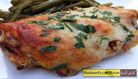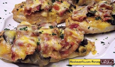 آماده سازی : 30 دقیقه پخت : 30 دقیقه مواد لازم : برای 4 نفر سینه مرغ 4 عدد نمک و فلفل 2 قاشق چای خوری فلفل سیاه 1 قاشق چای خوری ژامبون گوشت ورقه ای 6 عدد سس خردل 1/2 پیمانه عسل 1/2 پیمانه سس مایونز 1/2 پیمانه پیاز داغ 1 قاشق غذا خوری روغن نباتی 1 قاشق غذا خوری قارچ ورق شده 1 لیوان پنیر پیتزا رنده شده 2 لیوان جعفری خرد شده 2 قاشق غذا خوری سینه مرغ 4 عدد، بدون استخوان و بدون پوست ، به ضخامت 1 الی 1.5 سانت کوبیده شود طرز تهیه : 1- سینه مرغ را به همراه نمک و فلفل آغشته کنید، سپس آن را بپوشانید و برای 30 دقیقه در یخچال قرار بدید. 2- فر را از قبل روی دمای 175 درجه سانتی گراد (350 درجه فارنهایت) گرم کنید. ژامبون ها را در یک ماهیتابه بزرگ کمی سرخ کنید. 3- در یک کاسه متوسط سس خردل، عسل، مایونز و قطعات پیاز خرد شده را مخلوط کنید. نیمی از سس را کم کنید سپس آن را بپوشانید و در یخچال بزارید تا بعدا صرف شود. 4- روغن را با حرارت بیش از متوسط در یک ماهیتابه گرما بدهید سپس سینه مرغ را در آن قرار بدهید و هر تکه را 4 - 5 دقیقه در روغن سرخ کنید یا تا زمانی که برشته شوند. سینه ها را از ماهیتابه بردارید و در یک ظرف پیرکس متوسط قرار بدید. بعد از آن سس خردل عسل را به هر یک از سینه ها بریزید و بعد از آن در لایه های قارچ و ژامبون بزنید، ودر بالای آن پنیر خرد شده را بپاشید. 5- سپس مواد را در فر از قبل گرم شده به مدت 15 دقیقه بپزید یا تا زمانی که پنیر آب شود یا آب مرغ تمام شود. سپس جعفری را به عنوان چاشنی بزنید و غذا را با سس خردل عسل سرو کنید.